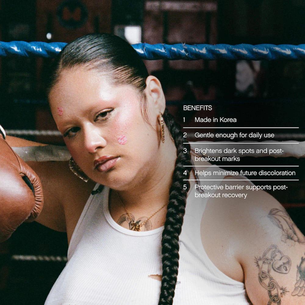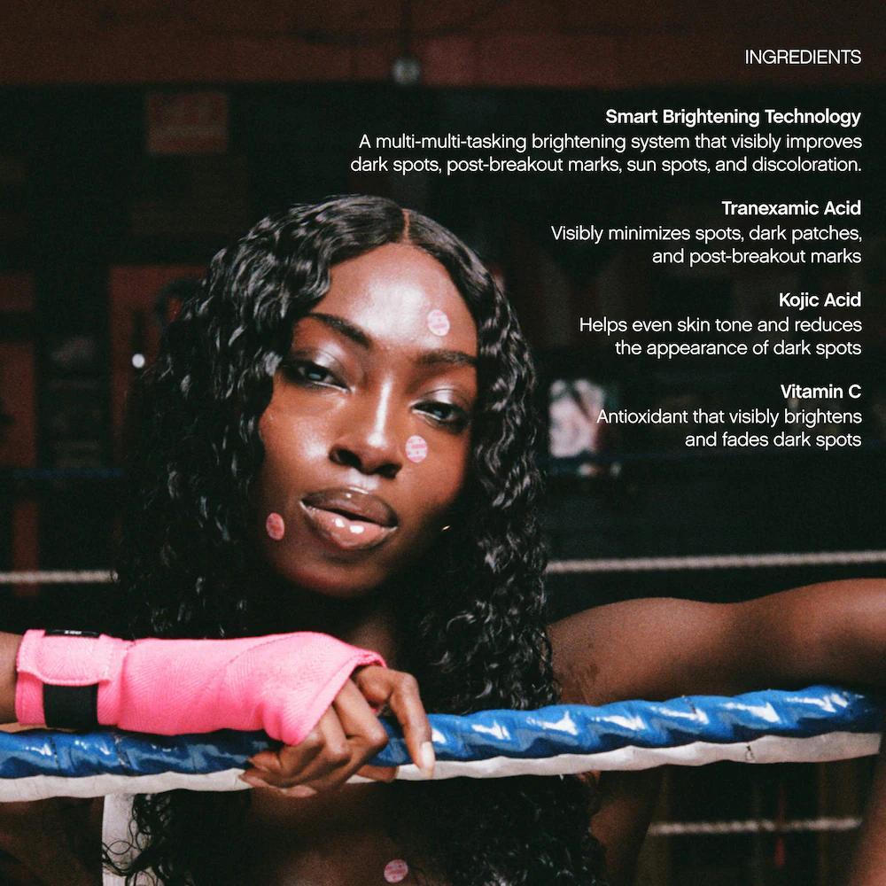 Se trata de un parche aclarante respaldado clínicamente que desvanece la apariencia de la hiperpigmentación en seis horas, previene las marcas post-erupción y protege la barrera cutánea. Es adecuado para todo tipo de piel: normal, seca, mixta y grasa. Los principales ingredientes son ácido tranexámico, ácido kójico y vitamina C que contribuyen a minimizar visiblemente manchas, parches oscuros y marcas post-acné. El producto es libre de parabénos y formaldehidos y es cruelty-free.
