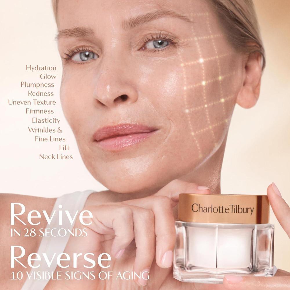 La crema Magic de Charlotte Tilbury es una crema hidratante facial que reafirma e hidrata, creando una base suave para el maquillaje. Está enriquecida con vitaminas C y E, complejos de péptidos y ácido hialurónico, proporcionando hidratación avanzada y reduciendo signos visibles de envejecimiento. Ideal para preparar la piel, refuerza la barrera cutánea y mejora el aspecto de firmeza y textura.