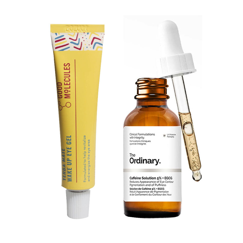 Incluye 01 Contorno de Ojos Yerba Mate Gel Good Molecules 15ml + 01 The Ordinary solución de Cafeína 5% + EGCG. Protege la piel de los efectos no deseados de la luz ultravioleta excesiva y el fotoenvejecimiento para una piel más luminosa y radiante. Uso debajo de los ojos hinchados, ojos cansados, ojeras.